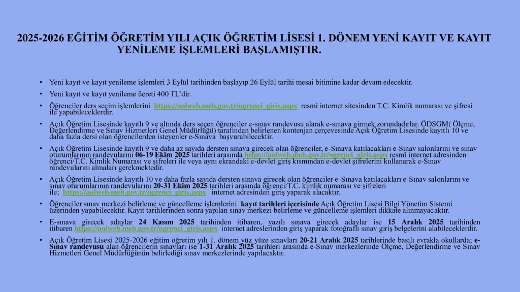 2025-2026 EĞİTİM ÖĞRETİM YILI AÇIK ÖĞRETİM LİSESİ 1. DÖNEM YENİ KAYIT VE KAYIT YENİLEME İŞLEMLERİ BAŞLAMIŞTIR.